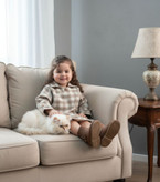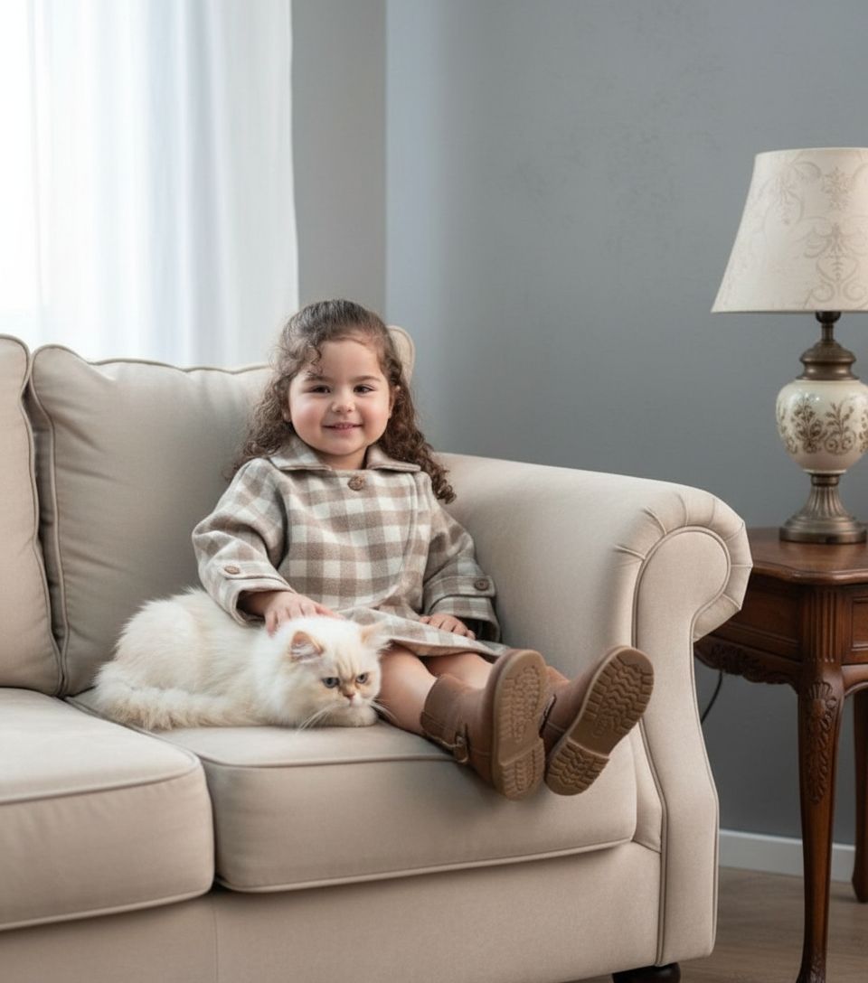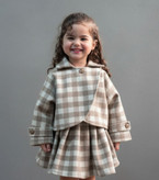 کت کوتاه با مدل یکطرفه و خطوط ساده، در کنار دامن چیندار با حجم لطیف، استایلی آرام و اصیل برای کودک میسازد.